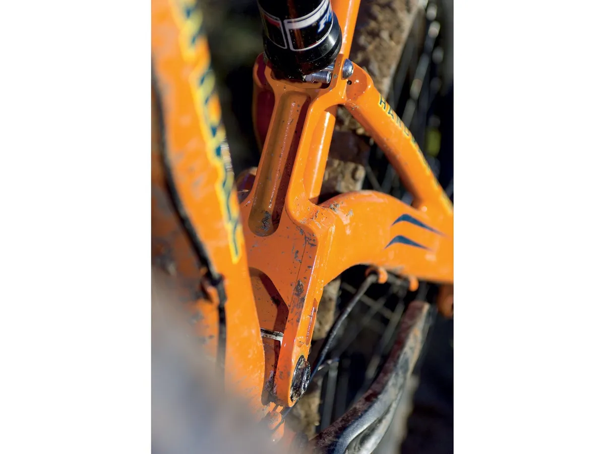 El tubo de dirección One Point Five de gran tamaño para la horquilla Lefty estÔ conificado externamente y el tubo diagonal se hincha hacia el pedalier. El tubo superior sigue una curva de gran radio para recoger el soporte del amortiguador trasero forjado y el extremo delantero del basculante es una sola pieza forjada con una placa frontal para mayor rigidez.
