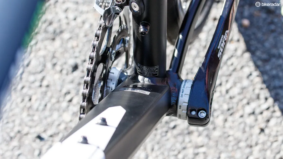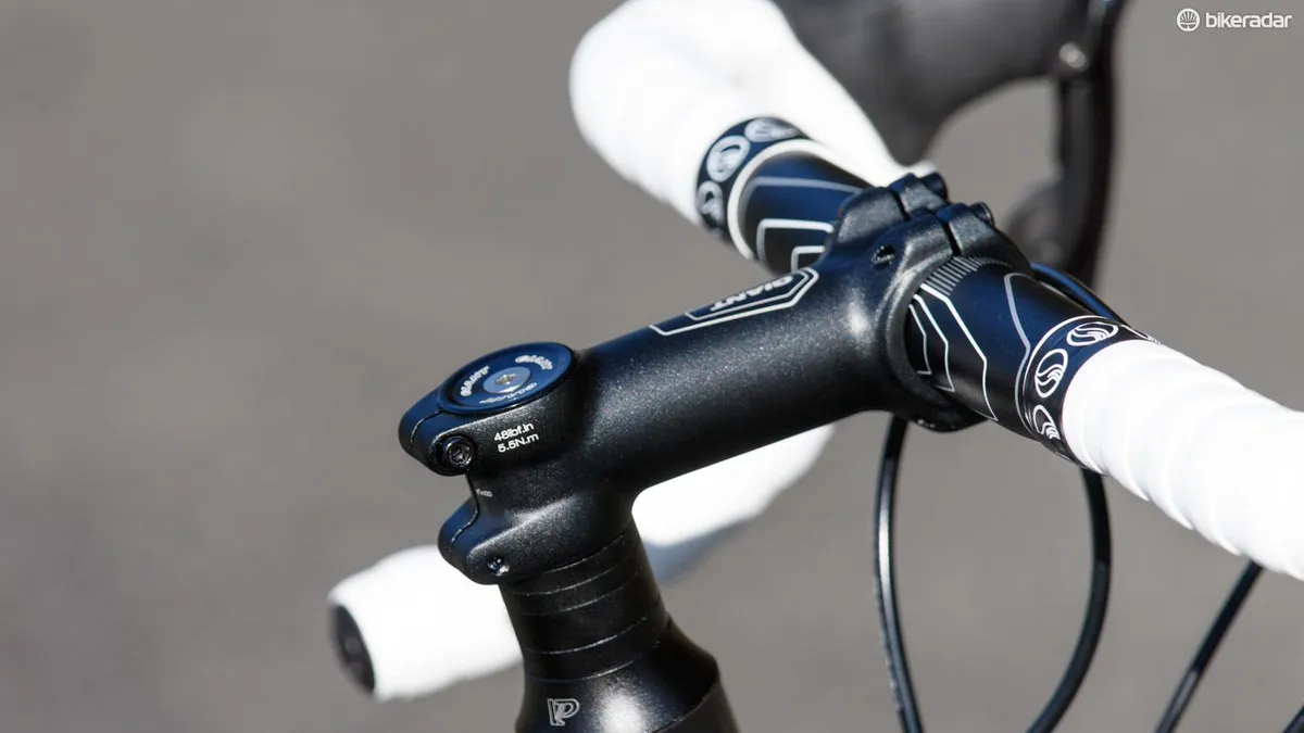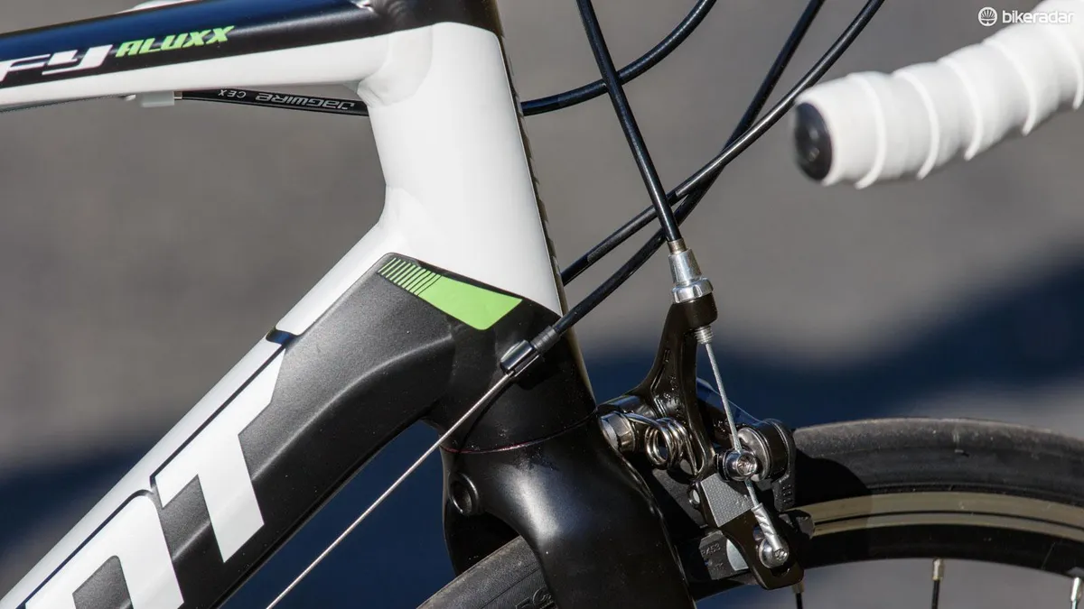 Uno de los pocos tubos redondos de la bicicleta es el tubo de dirección, que alberga una horquilla de dirección cónica. Con un tubo de dirección de aleación que agrega un poco de peso, la horquilla no es demasiado sofisticada, pero las palas de carbono ayudan a reducir el ruido de la carretera.