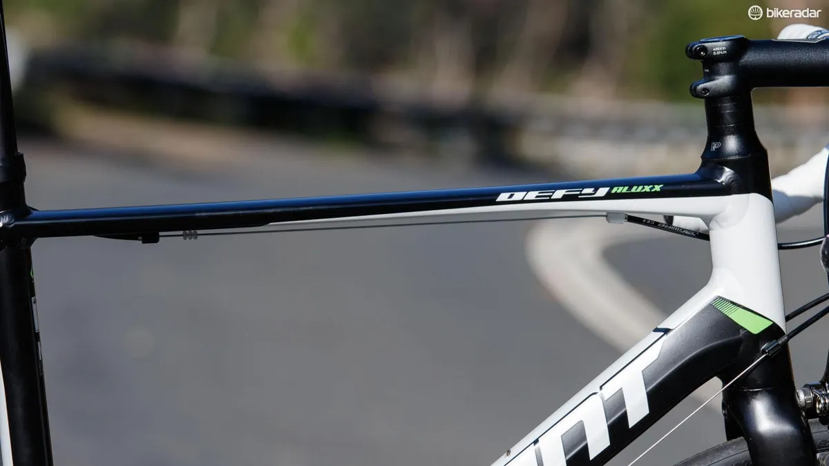 Mirando por encima del marco de perfil cuadrado del Defy, Giant claramente ha prendido fuego al viejo libro de reglas de tubo redondo y lo ha arrojado por la ventana. Mientras que los marcos de aluminio del pasado dependĆan de tubos redondos de gran diĆ”metro, este Defy utiliza rectĆ”ngulos para las formas de sus tubos.