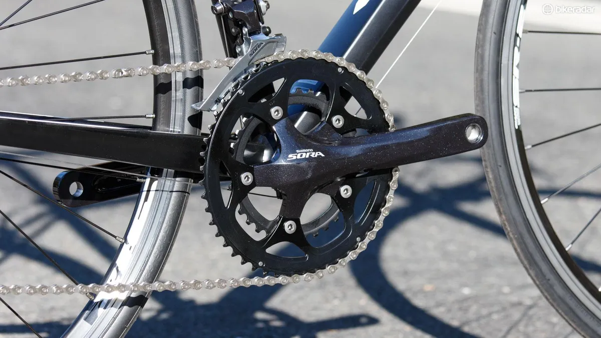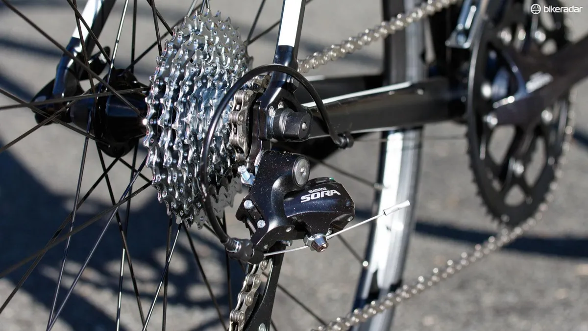 Comenzando con las piezas que sà muestran valor, el Defy 3 ofrece una transmisión Shimano Sora de nueve velocidades. Con esto, la biela delantera Sora 50/34t ofrece un excelente rendimiento de cambio, mientras que sus piñones traseros son igualmente confiables.