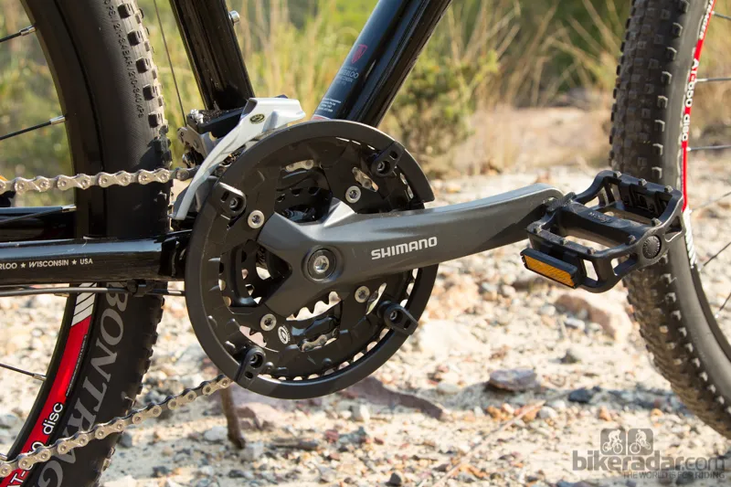 La transmisión de 27 velocidades proporcionó un amplio rango y la combinación de Shimano Acera y Altus funcionó mejor de lo esperado, aunque el desviador trasero suave provocó un golpe excesivo de la cadena. La palanca de cambios Acera ofrecĆa una mejor sensación que las palancas de cambio mĆ”s baratas de uso comĆŗn. El juego de platos Shimano bĆ”sico es pesado y el protector de pierna de plĆ”stico no durarĆ” muchos saltos perdidos, pero los platos reemplazables fueron una ventaja.